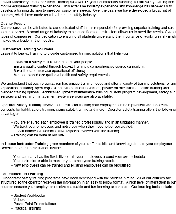 With such a large variety of options for certification, you are assured to come across one that meets your needs. Whether you are searching for someone to come instruct at your place of work or would prefer to train at our facility, we can accomodate all your requests. Each course can be tailored to your equipment and workplace.